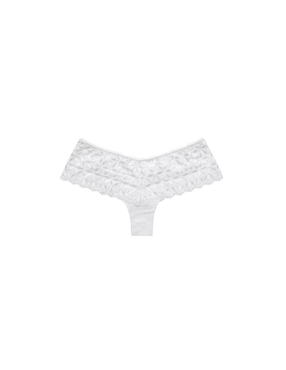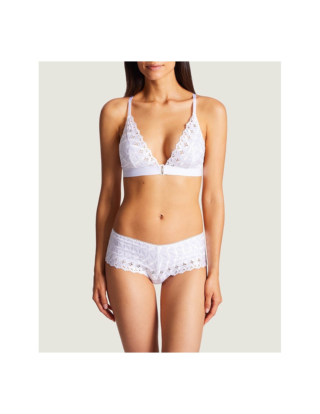 Le shorty Saint-tropez illustre la modernité sensuelle de la ligne. Sa coupe droite offre une allure contemporaine et séductrice grâce à un discret laçage au bas des reins. La broderie anglaise s'épanouit sur la peau pour s'échancrer à l'arrière.