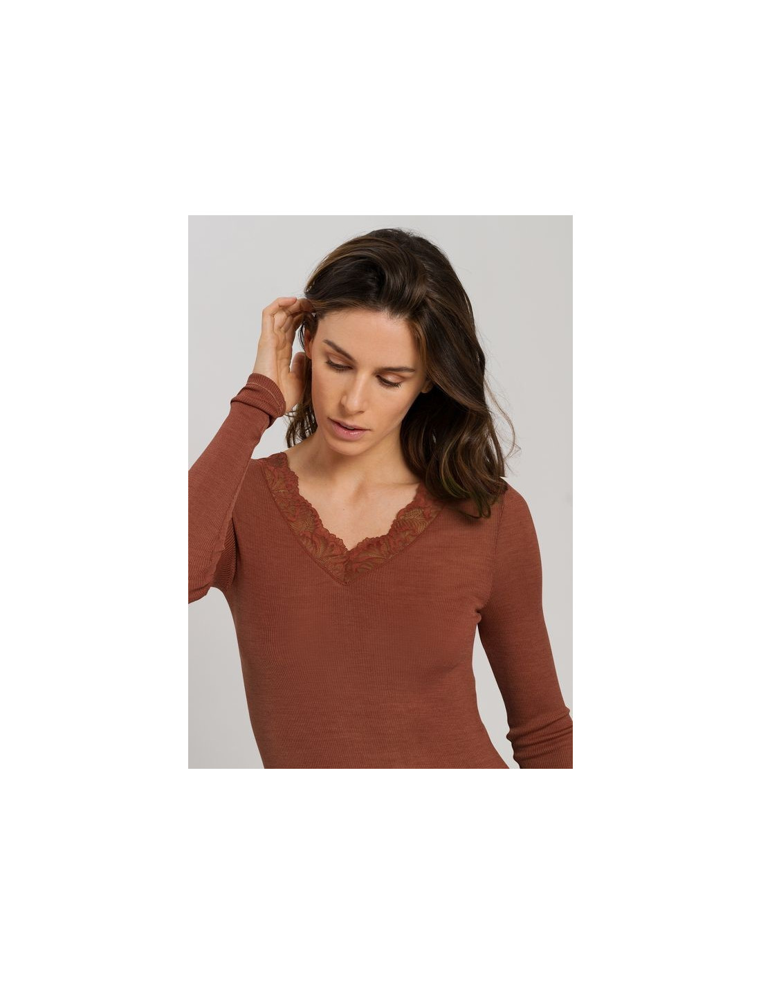 Top manches longues, encolure V en dentelle idéal en "dessus-dessous": peut se porter sous un pull ou un chemisier mais aussi en version chic avec une veste tailleur par exemple...