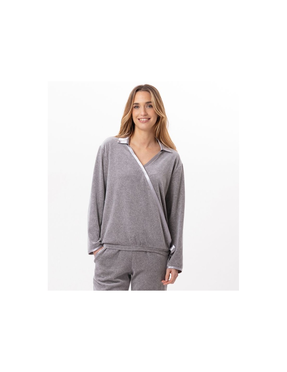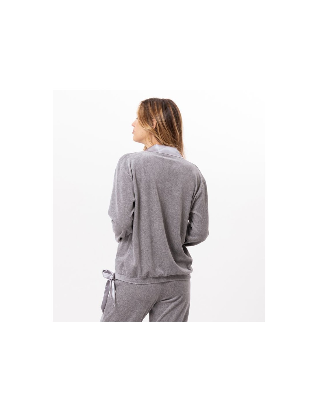Au quotidien, chez vous, à l’extérieur ou pour la nuit, les 3 options s’offrent à vous ! La forme cache-coeur du sweat présente un joli col V et un lien à nouer sur le bas pour l'ajuster. Le velours ras au toucher ultra doux s’habille de satin sur des volumes comfy, pour des tenues un brin sportswear.